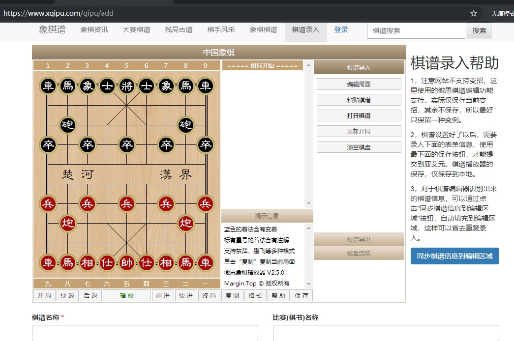 登录成功后,点击导航里面的棋谱录入链接,https://www.xqipu.com/qipu/add